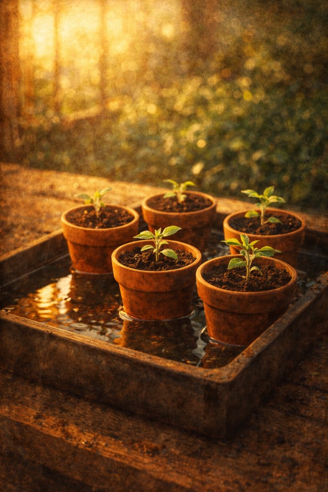 Kiedy sąsiadka pokazała mi swój "system", przez chwilę myślałem, że żartuje. Wstawiała doniczki do tacy z wodą. Tyle. Ale jak tylko zobaczyłem efekty — skończyłem z podlewaniem od góry przy rozsadzie na dobre.
