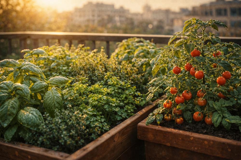 Do pomidora koniecznie dodaj paliki lub siatkę – nawet karłowe odmiany mają tendencję do wywracania skrzynki, gdy zaowocują.