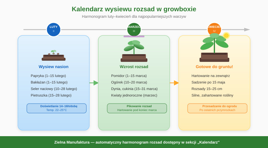 Aby ułatwić planowanie w sekcji "Kalendarz" aplikacji Zielna Manufaktura, poniżej znajduje się harmonogram przygotowania rozsad w growboxie przed przesadzeniem ich do gruntu lub szklarni: