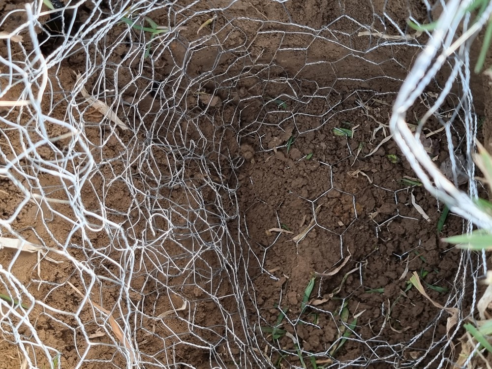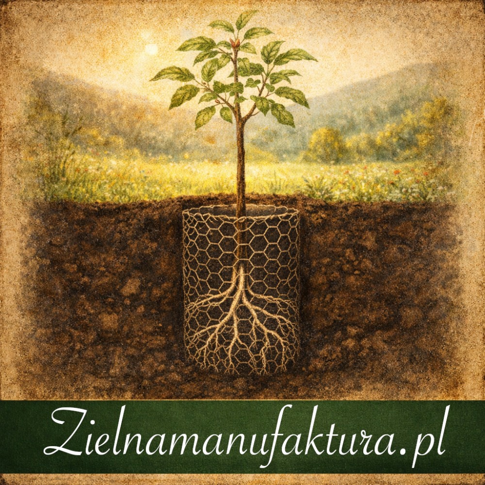 To clou całego planu. Każde nowe drzewko sadzimy teraz w "koszyku" z siatki ocynkowanej o małych oczkach. Wykopuję dół, formuję z siatki cylinder, wstawiam go w dziurę, wypełniam żyzną ziemią i sadzę drzewko. Korzenie rosną wewnątrz metalowej klatki, której karczownik nie przegryzie.