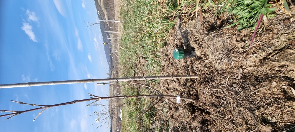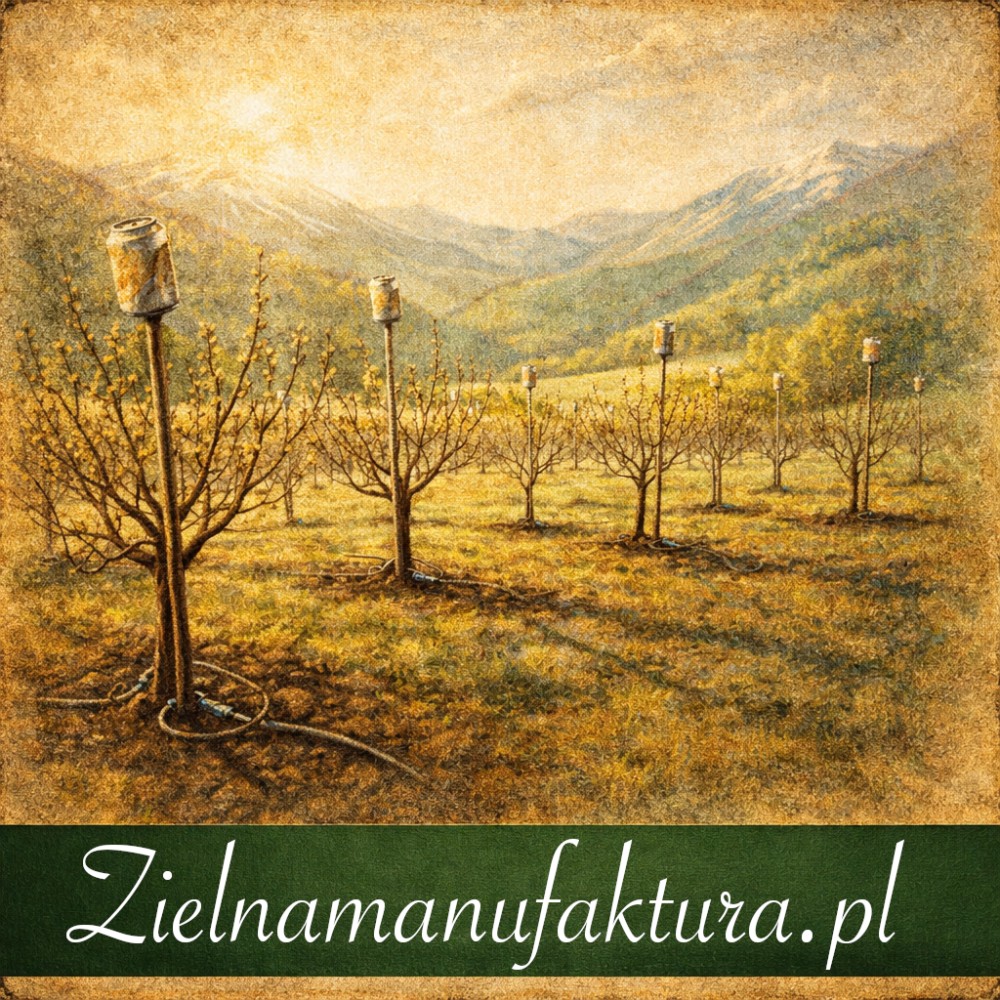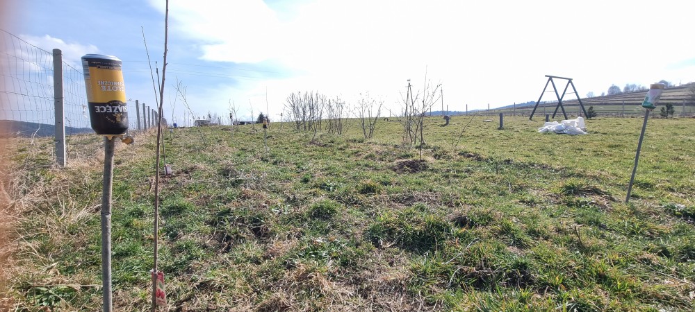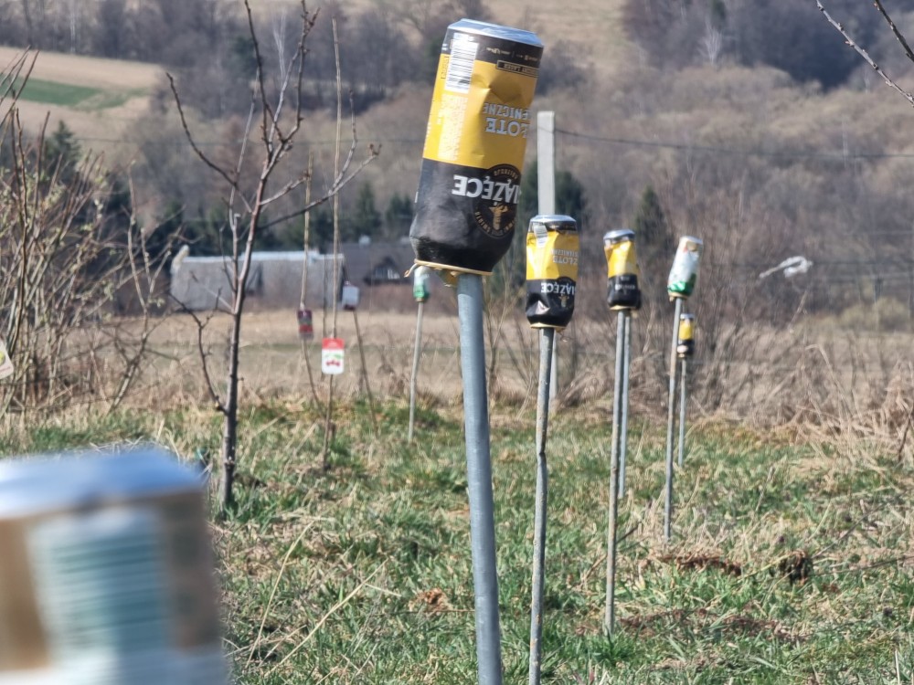 Wróciłem z 12 nowymi drzewkami: jabłonie, grusze, śliwki, wiśnie, czereśnie. Każde posadzone w koszyku z siatki ocynkowanej. Nad każdym — puszka po "Książęcym" - pszenicznym, kołysząca się na wietrze.