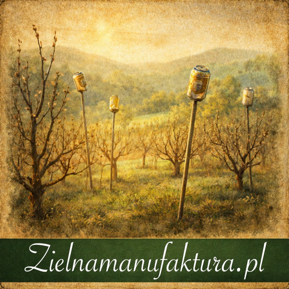 Tak, dobrze czytasz. Puszki po piwie wypitym wieczorem wylądowały na rurkach aluminiowych po tunelu foliowym, który też nie przetrwał zimy. Grzechoczą na wietrze, wibrują razem z rurką. Cały sad wygląda teraz jak instalacja artystyczna. Albo bardzo zaangażowany recycling.