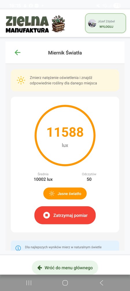 Działanie jest proste: otwierasz Miernik Światła w aplikacji, trzymasz telefon w miejscu, gdzie chcesz coś posadzić, i czekasz kilkadziesiąt sekund. Aplikacja wykonuje automatycznie serię odczytów – standardowo 50 pomiarów – i wylicza z nich średnią. Wynik wyświetlany jest w luksach razem z bieżącym odczytem, żebyś widział, czy wartość jest stabilna, czy mocno się waha.