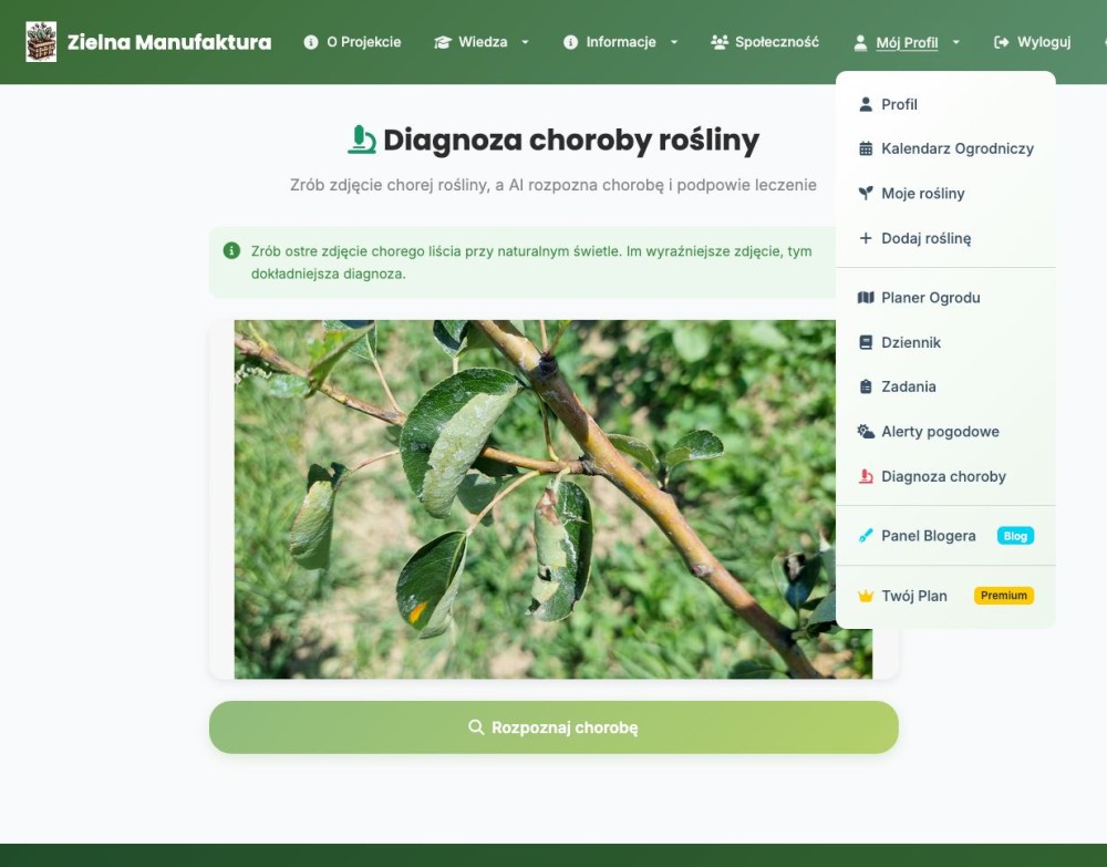 Rozpoznávání nemocí rostlin z fotografie — nová AI funkce v Zielona Manufaktura