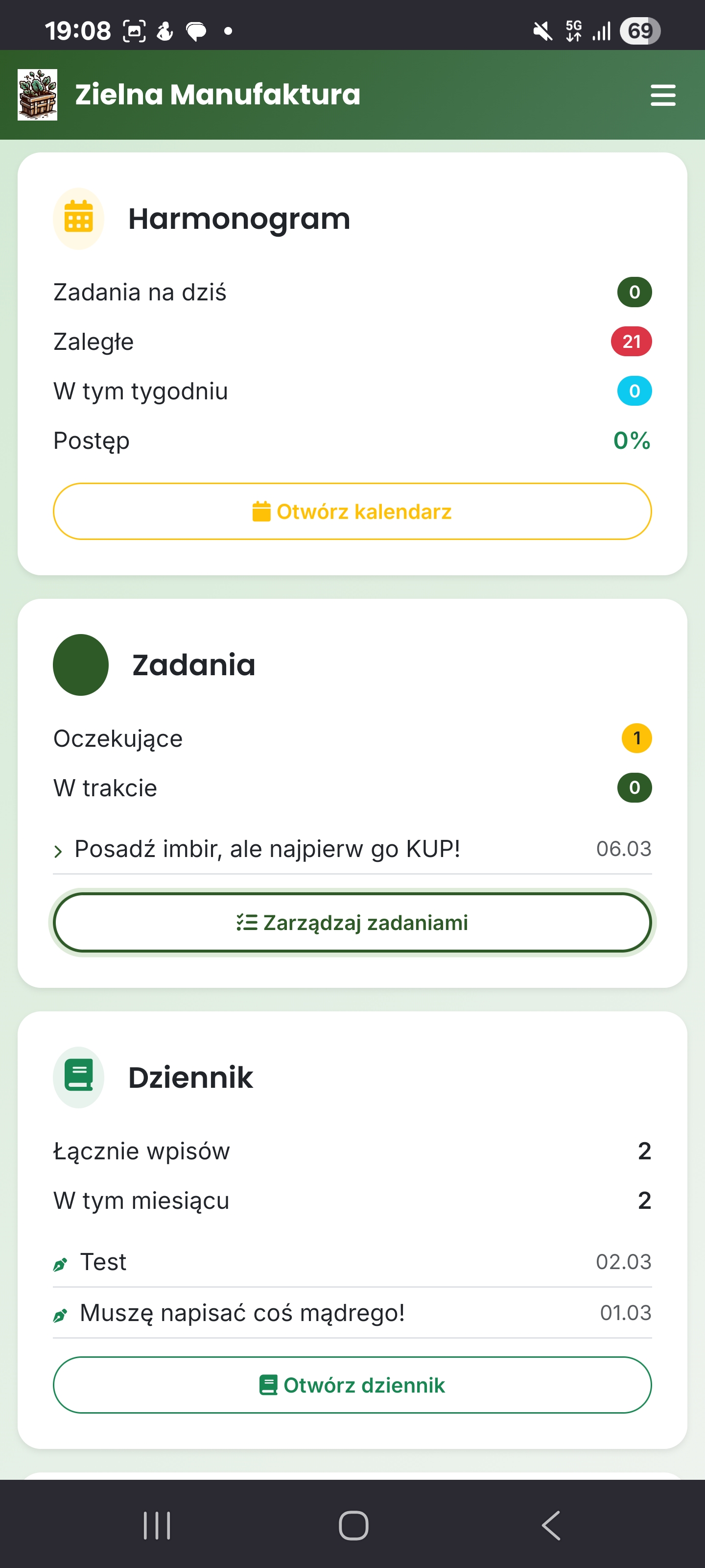 📓 Dziennik Chronologiczne wpisy z Twojego ogrodu — liczba wpisów łącznie i w tym miesiącu, plus podgląd najnowszych. Dziennik to coś, co doceniasz dopiero po kilku miesiącach używania. Kiedy w sierpniu zastanawiasz się, dlaczego papryka nie wzeszła, masz odpowiedź z marca.