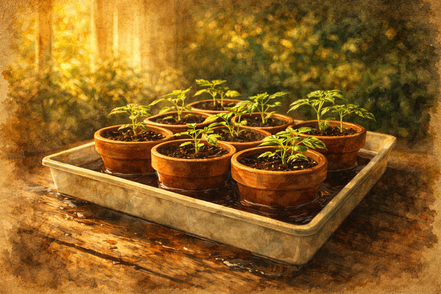 W skrócie: Podlewanie siewek z góry moczy liście i sprzyja zgorzel. Wstawianie skrzynki do wody na 20–30 minut daje wilgoć bez ryzyka — i korzenie które rosną w dół.