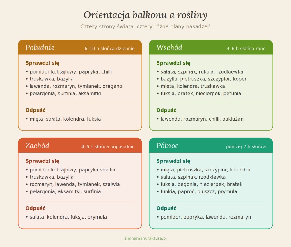 Wschód to 4–6 godzin słońca rano, potem chłodniejsze popołudnie w cieniu. Dla balkonowego ogrodnika-amatora to właściwie idealne warunki startowe: dość słońca na produkcję warzyw i ziół, ale bez dramatów cieplnych, z jakimi zmaga się balkon od południa.