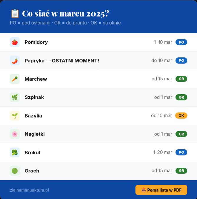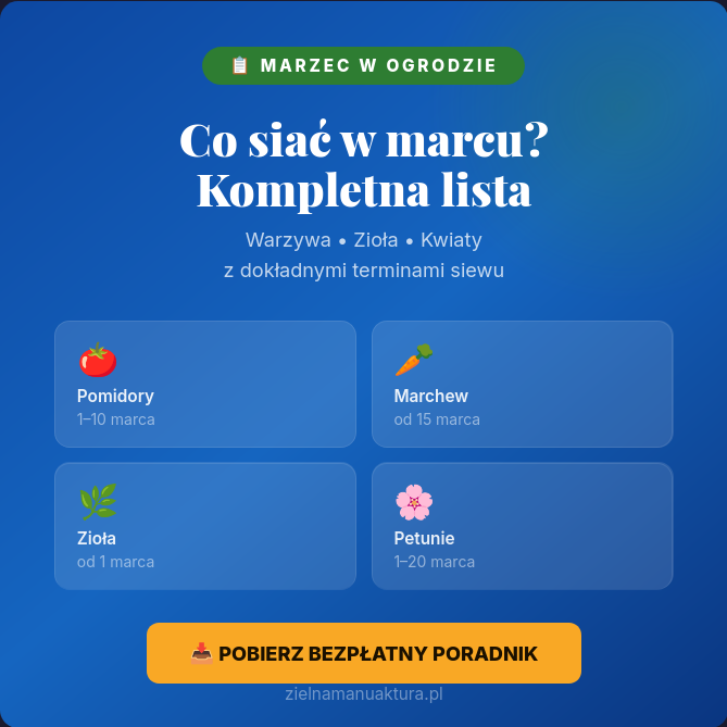 Marzec to miesiąc siewów i decyzji. Im lepiej zaplanujesz ten czas, tym obfitszy będzie Twój sezon. Kluczowe zasady: ciepło dla rozsady pod osłonami, ostrożność przy siewach gruntowych (przymrozki!) i doświetlanie dla wszystkich siewek zapoczątkowanych przed połową marca.