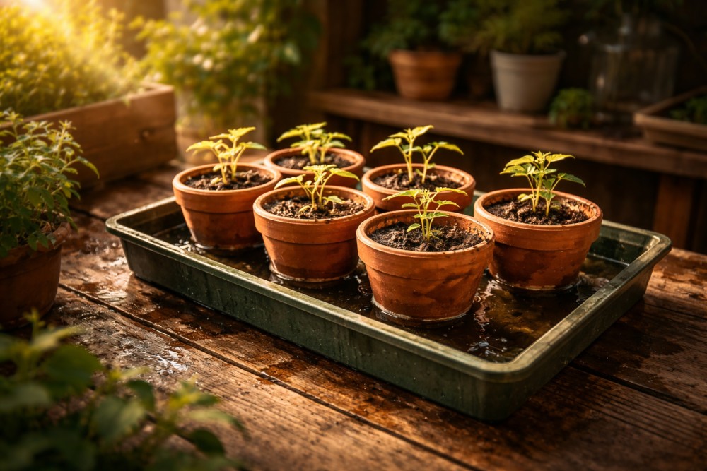 Kiedy sąsiadka pokazała mi swój "system", przez chwilę myślałem, że żartuje. Wstawiała doniczki do tacy z wodą. Tyle. Ale jak tylko zobaczyłem efekty — skończyłem z podlewaniem od góry przy rozsadzie na dobre.