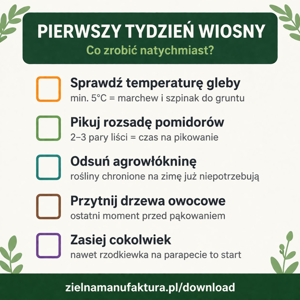 Gleba powinna mieć minimum 5–7°C — sprawdź termometrem lub używając prostej zasady: jeśli możesz pracować w niej bez rękawiczek przez 5 minut bez dyskomfortu, jest gotowa.