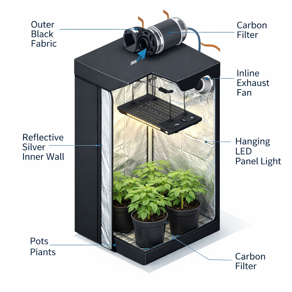 • Budowa: Składają się z metalowego stelaża (rurki na zatrzaski) pokrytego grubym, światłoszczelnym materiałem. Wnętrze wyłożone jest mylarem – folią o strukturze odbijającej do 95-98% światła. Posiadają wbudowane "rękawy" wentylacyjne do przeciągnięcia kabli i rur.