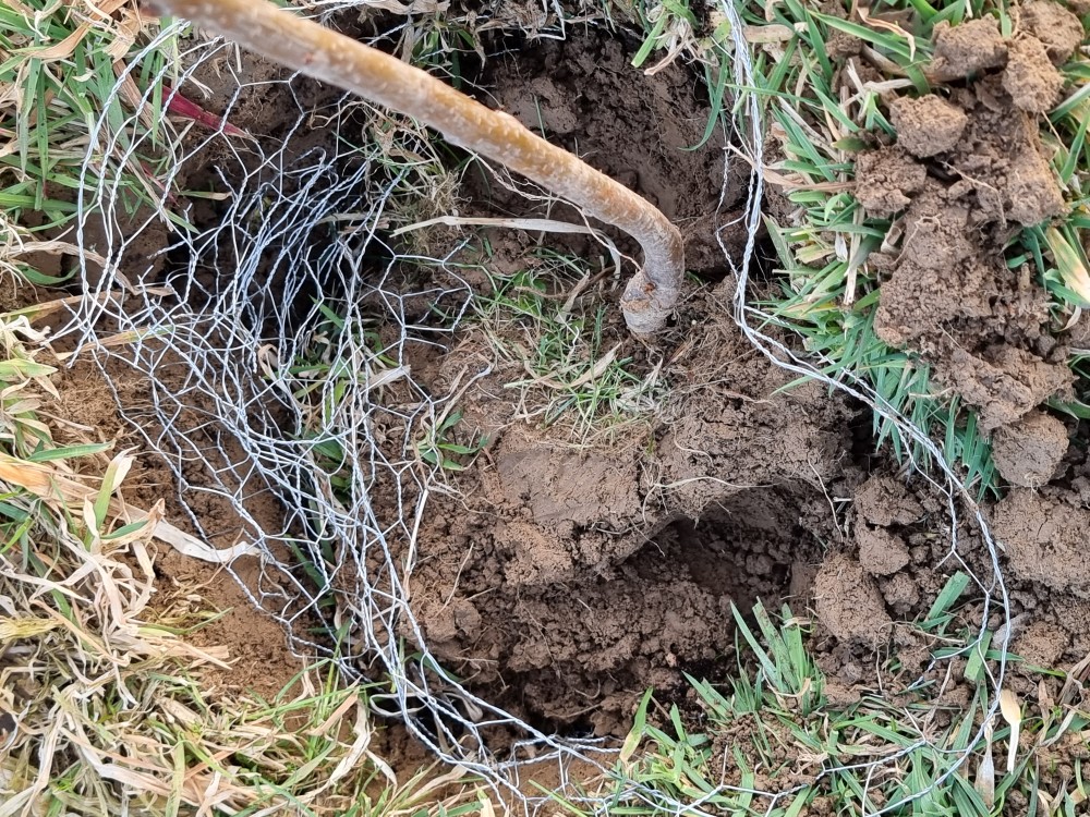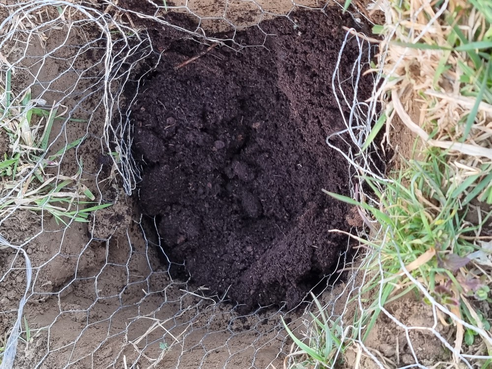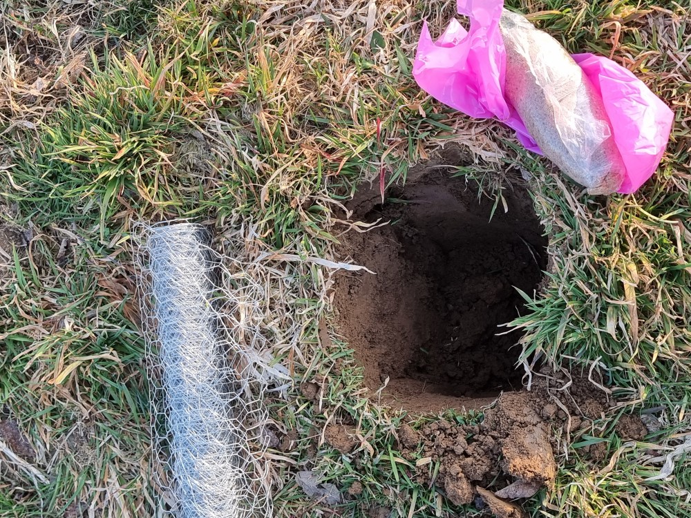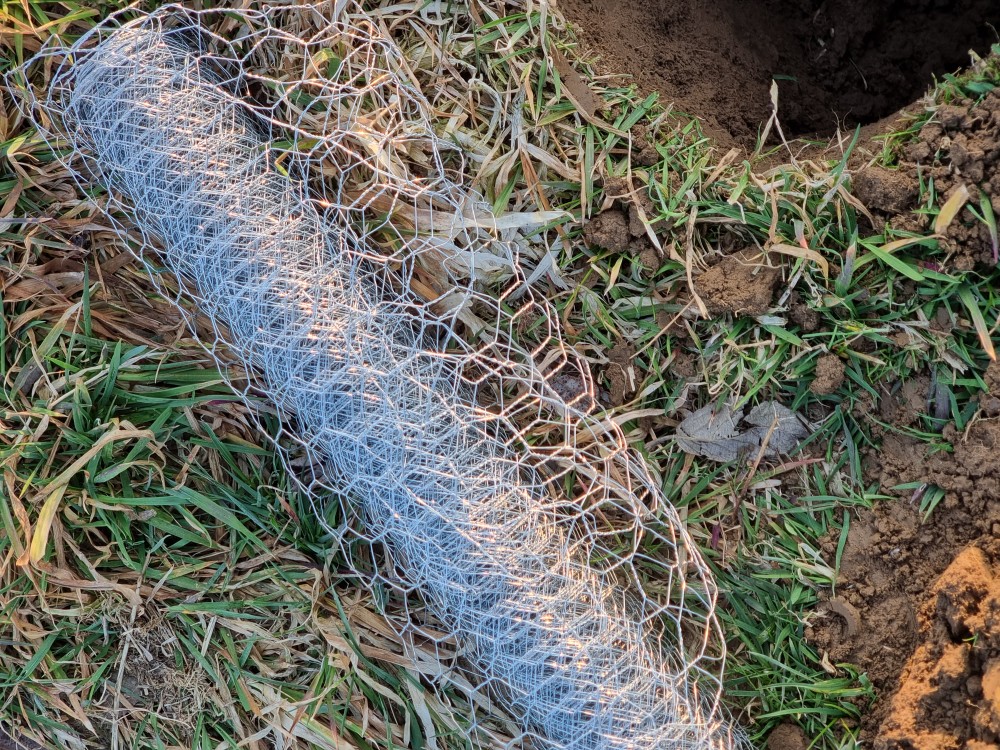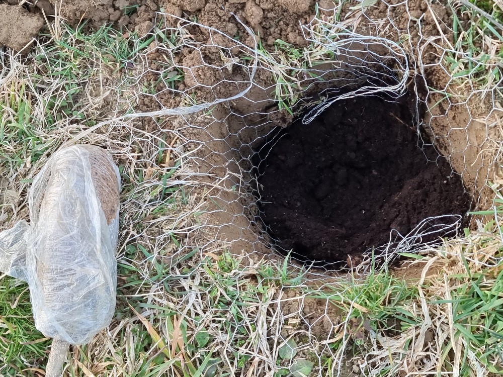 To clou całego planu. Każde nowe drzewko sadzimy teraz w "koszyku" z siatki ocynkowanej o małych oczkach. Wykopuję dół, formuję z siatki cylinder, wstawiam go w dziurę, wypełniam żyzną ziemią i sadzę drzewko. Korzenie rosną wewnątrz metalowej klatki, której karczownik nie przegryzie.
