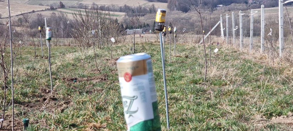 Wróciłem z 12 nowymi drzewkami: jabłonie, grusze, śliwki, wiśnie, czereśnie. Każde posadzone w koszyku z siatki ocynkowanej. Nad każdym — puszka po "Książęcym" - pszenicznym, kołysząca się na wietrze.