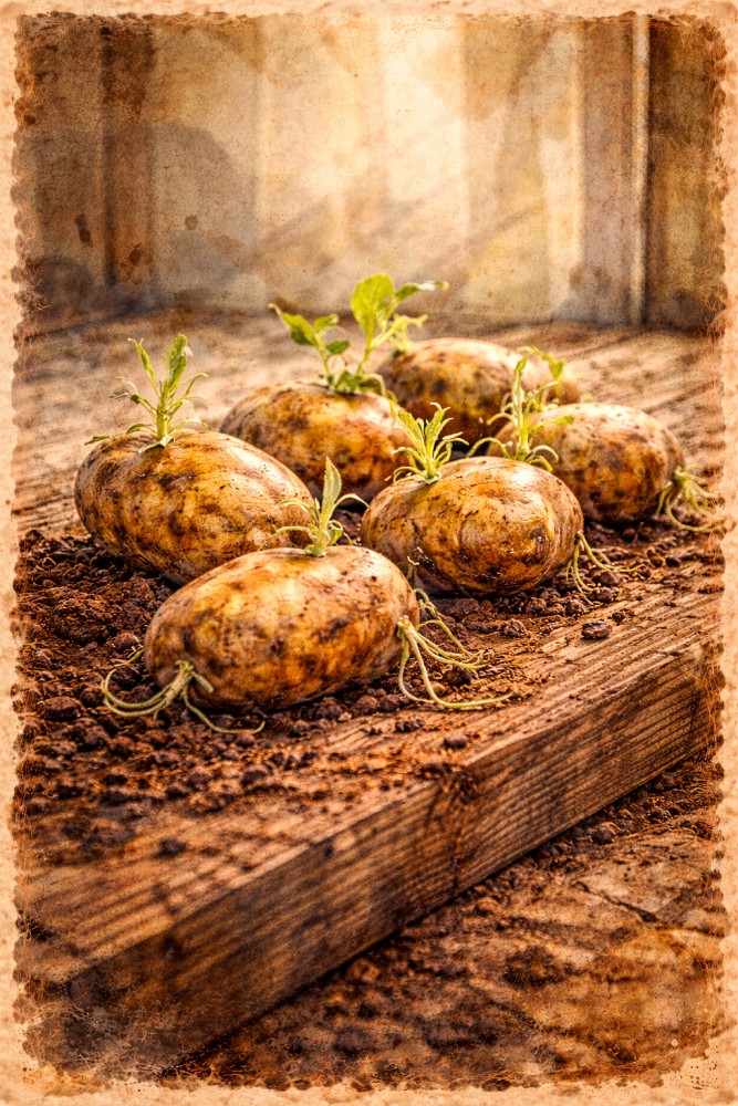 Praktycznie wygląda to tak: w połowie marca wyciągasz bulwy ze skrzynki, rozkładasz je w jednej warstwie — oczkami (zagłębieniami) ku górze — na parapecie, w garażu, w szopie. Po 2–3 tygodniach kiełki osiągają długość 1–2 cm i sadzonka jest gotowa do drogi w ziemię.