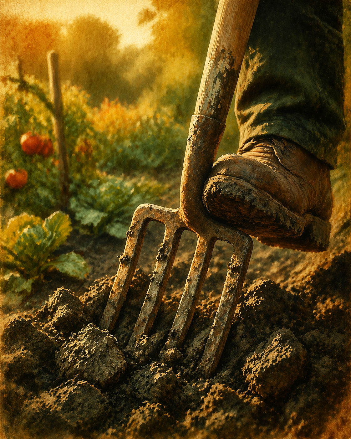Nie chodź po mokrej glebie gliniastej — jeden przejazd taczką po mokrej glebie niszczy strukturę którą budujesz całymi sezonami.